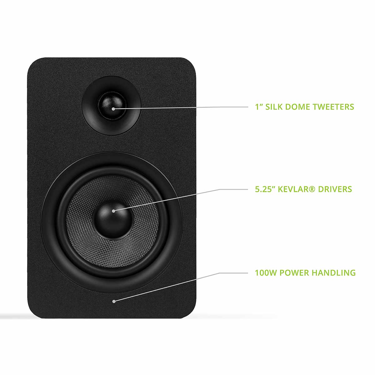 Grilles do not attach to the front of the speaker cabinets, and this gives the YU Passive series a nice, clean professional studio monitor look with a view of the woofer and the tweeter. The YU Passive 5.25” consists of a 5 ¼-inch high-strength Kevlar® woofer (hence the name “Passive 5.25”). It also features a tuned bass port on the back of each cabinet to produce tight bass with low distortion, and high-quality Knurled speaker binding posts that connect with an integrated amplifier or a home theater receiver.